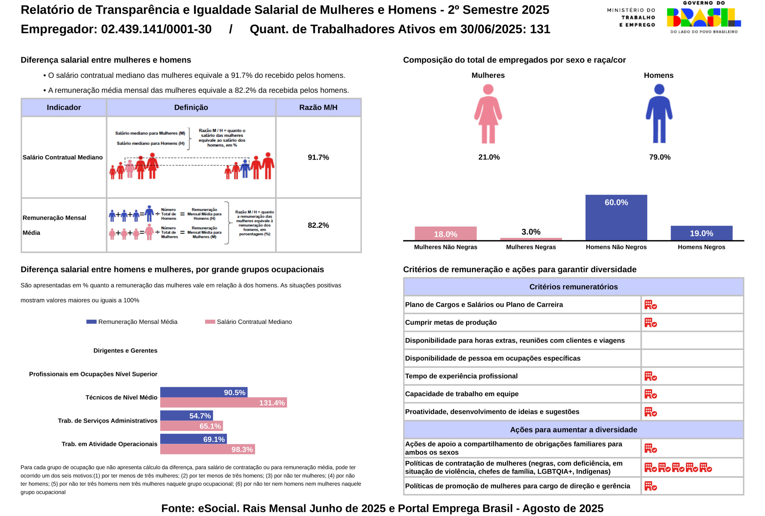 Em conformidade com as diretrizes estabelecidas pelo Ministério do Trabalho e Emprego, nossa empresa tem um compromisso firme e contínuo com a transparência, a igualdade de direitos e a valorização de todos os nossos colaboradores, reafirmando nossa determinação em promover a igualdade salarial entre mulheres e homens, garantindo que práticas justas e equitativas sejam seguidas em todas as áreas da organização.